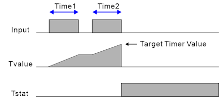 This is an accumulating timer. It is similar to the ontimer. It turns on after a set amount of time has passed. However, even if the input signal is turned off in the middle, the timer is not reset and maintains its previous state. To reset the timer, you must enter 0 in Tvalue[timer number] and Tstat[timer number]. In other words, the reset must be done manually.