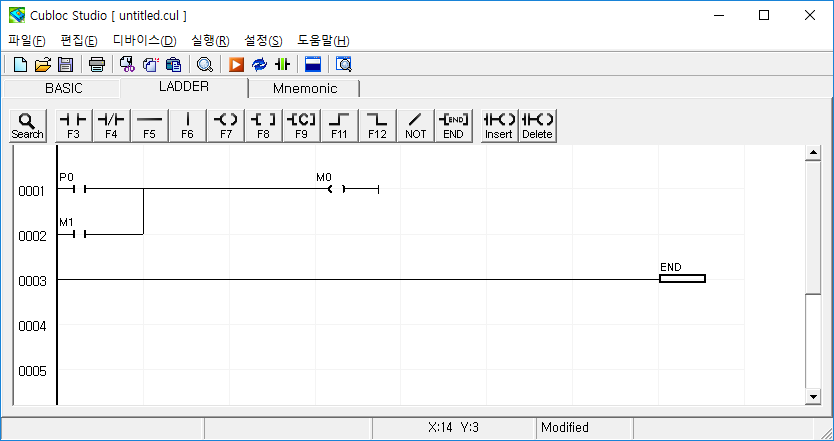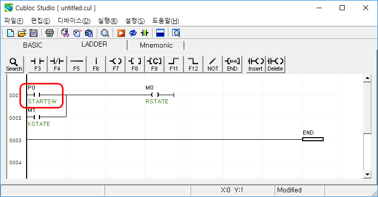 레더로직에서 사용하는 릴레이명칭은 P0, M0 와 같이 영문자와 숫자로 조합되어 있어, 이를 이용하면 아래와 같은 형태의 레더로직이 됩니다.