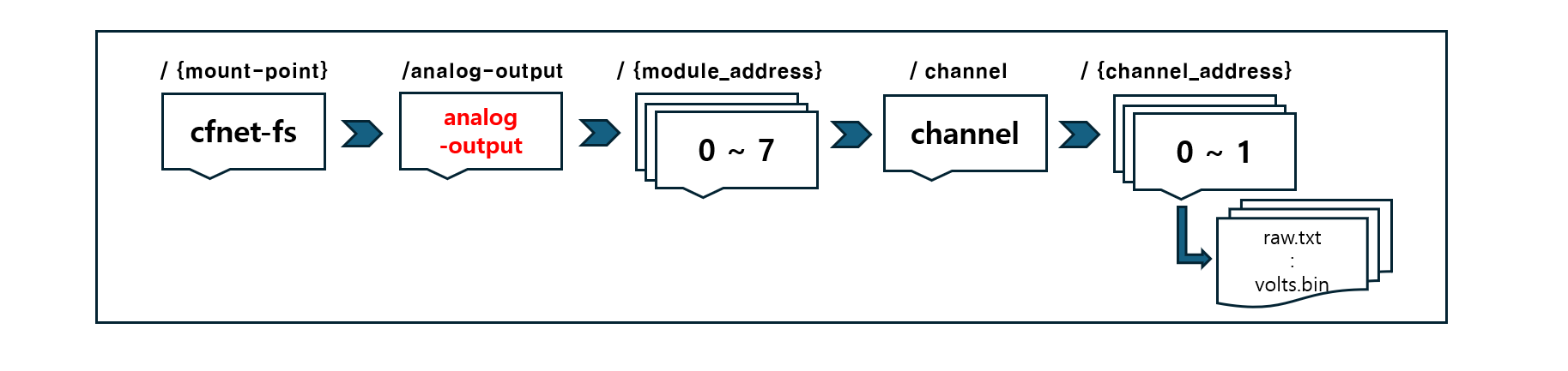 - 각 아날로그 출력모듈(CFDAC)은 cfnet-fs 마운트 지점 아래에 있는 디렉터리로 표현됩니다.