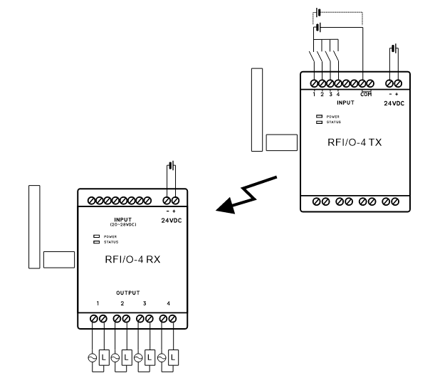 RF-IO 4는 무선 송·수신 방식의 I/O 장비로, 송신부(TX)와 수신부(RX)가 1세트로 구성됩니다.