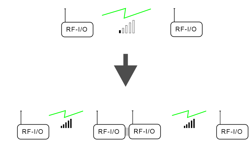 RF-I/O를 중간에 한셋트를 더 설치하는 방법입니다. 중간에 설치한 수신부와 송신부는 서로 유선연결해야 합니다. 블루투스 방식은 한공간에 여러개 설치가 가능하므로, 다음방법을 사용하실 수 있습니다.