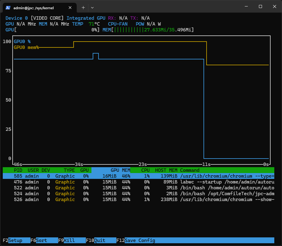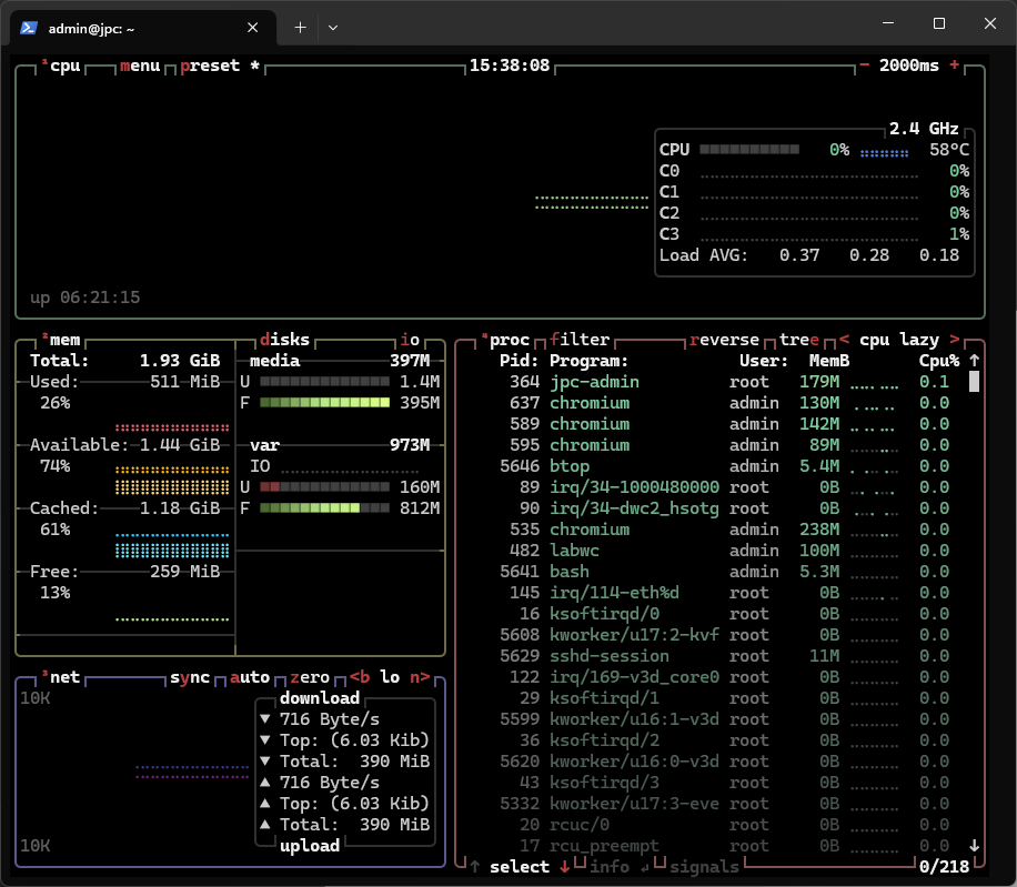Use the btop to monitor CPU, memory, network, and disk I/O resource utilization. It also allows for monitoring the SoC's core temperature.