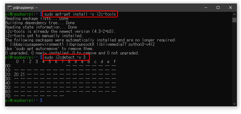 • Install I²C device scan and control utilities: sudo apt-get install -y i2c-tools