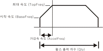 Stepaccel 명령어는 가감속 패턴형태로 파형을 발생시키는 명령입니다. 주로 스탭모터 구동용 펄스를 만들때 사용합니다.