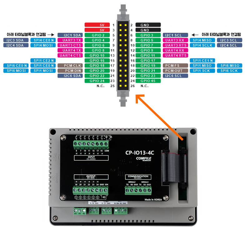 CP-IO13-4C의 GPIO(IN,OUT), SERIAL 핀맵은 아래와 같이 연결되어 있습니다.