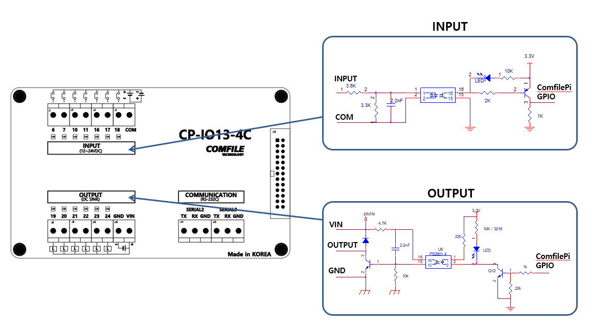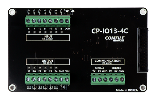 CP-IO13-4C은 ComfilePi CPi 4C 모델에 연결하여 사용할 수 있는 I/O보드 입니다. 입력 7점 출력 6점 RS-232C X 2채널로 구성되어 있고, 입출력 회로가 ComfilePi IO와 전기적으로 분리되어 있어 보다 안전하게 ComfilePi를 사용할 수 있습니다.