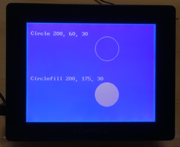 #include "CT18XX" Ct18contrast 150 Locate 1,1 Print "Circle 200, 60, 30" Circle 200, 60, 30 '원 그리기 Locate 1,8 Print "Circlefill 200, 175, 30" Circlefill 200, 175, 30 '채워진원 그리기