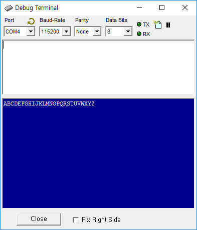 RX와 TX단자를 서로 쇼트시킨뒤 아래 프로그램을 실행시키면, Debug터미널에 A부터 Z까지가 표시됩니다.