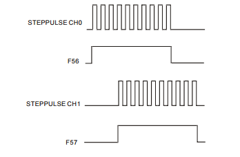 펄스 출력상태를 레더로직의 특수릴레이로도 확인할 수 있습니다. 채널0이 출력중일때는 _F(56)이 1이 됩니다. 채널1이 출력중일때는 F(57)이 1이 됩니다. StepStop에 의해서 멈추거나, 정해진 펄스가 모두 출력되어서 멈춘뒤에는 자동적으로 0이 됩니다.