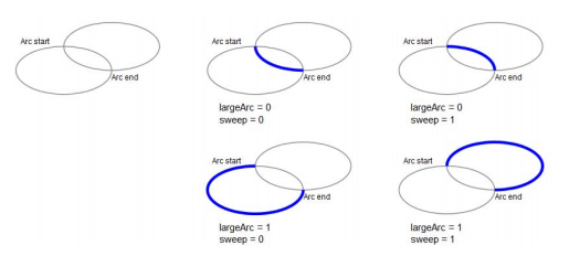 LargeArc와 sweep 설정에 따라 표시되는 호의 위치와 방향을 선택할 수 있습니다.