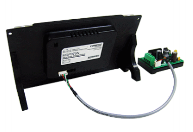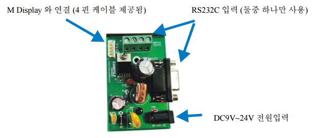 파워옵션 보드는 9V~24VDC 전원을 인가하면 5V (1A)을 출력해주는 보드입니다. 이 5V가 M-Display모듈쪽에서 쓰는 주전원입니다. 또한 D-SUB 콘넥터 타입의 RS232C 포트가 있어 PC 와 직접 연결하실 수 있습니다.
