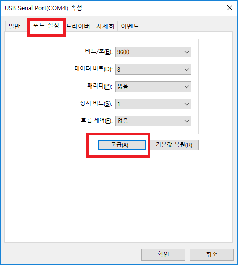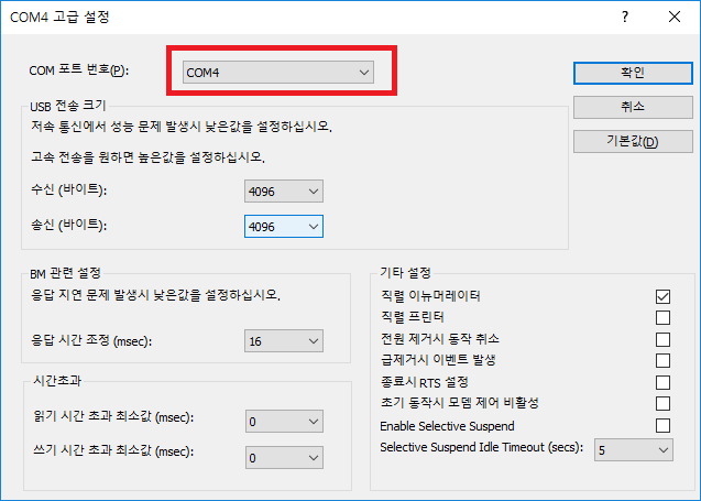 제어판>장치관리자>포트(COM) 번호를 확인후 “COM 10” 이하의 번호로 설정후 확인부탁드립니다.