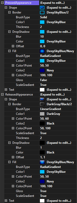 This IsPressed property can be set at design time or runtime to cause the button to press or release respectively. It can be read at runtime to inspect whether or not the button is pressed or released. The IsPressed property returns true when the button is pressed, and false when the button is released.