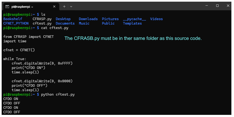 To develop Python applications for CFNET I/O expansion modules on the Modular Pi, you must use the CFRASP.py module (library) file.