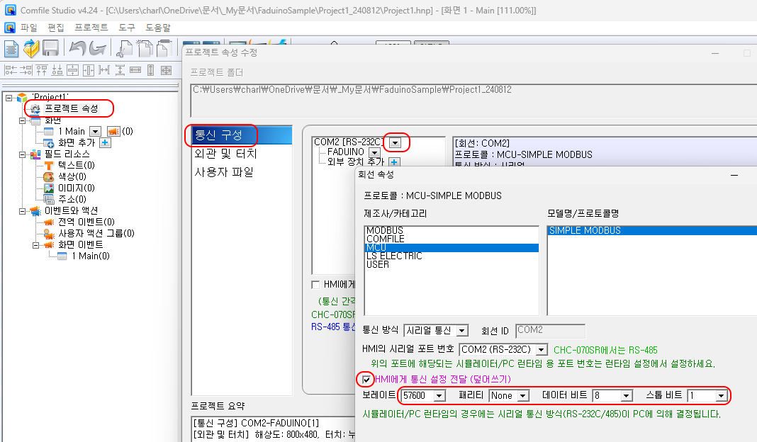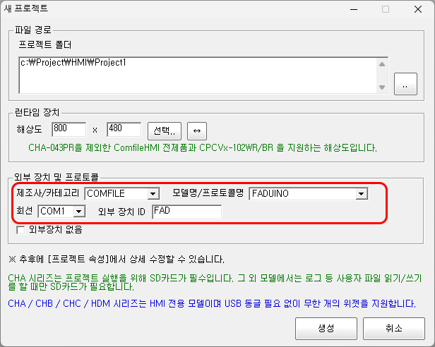 Comfile Studio (ComfileHMI 작화 소프트웨어) 에서 프로젝트 생성하실때, 아래와 같이 선택하세요.