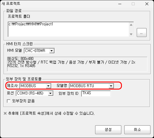 TK4S는 RS485이므로 RS485가 가능한 ComfileHMI 모델을 사용해야 합니다. COM3 (RS485)를 사용해서 HMI와 TK4S를 서로 연결한뒤 아래처럼 프로젝트 설정을 하세요.