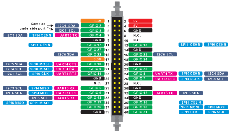 뒷면에 40 핀 헤더소켓이 있는 모델은 아래 핀맵으로 되어 있습니다.