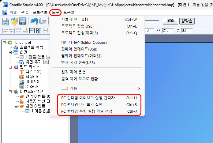 - 상단 메뉴 <도구> → <PC 런타임 미리보기 실행>