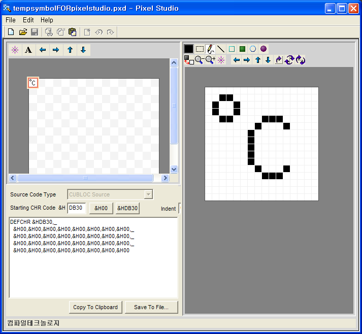사실, 이런 방법으로 그림이나 심볼을 그리기란 쉬운 방법이 아닙니다. 저희가 제공하는 Pixel Studio를 사용하면 보다 편리하게 그림을 그릴 수 있습니다. 최종결과는 DEFCHR명령 포맷으로 바꿀 수 있습니다.