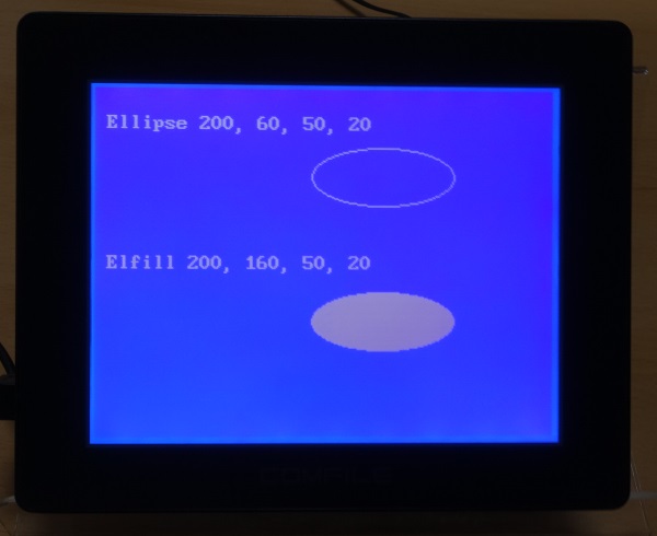 #include "CT18XX" Ct18contrast 150 Locate 1,1 Print "Ellipse 200, 60, 50, 20" Ellipse 200, 60, 50, 20 '타원 그리기 Locate 1,7 Print "Elfill 200, 160, 50, 20 " Elfill 200, 160, 50, 20 '채워진 타원 그리기