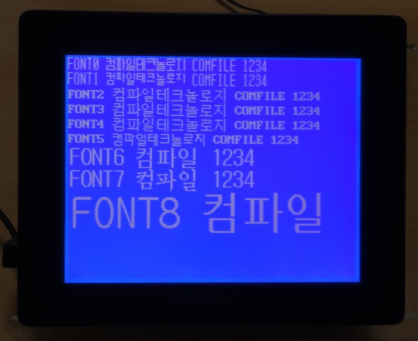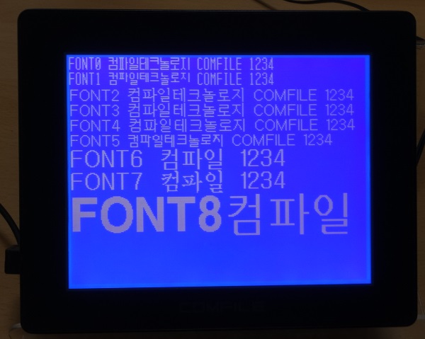 #include "CT18XX" 'CT18XX에서 동작가능한 소스입니다. Dim CT18_cont_value As Integer Cls Wait 200 CT18_cont_value = Eeread(&hfff,1) If CT18_cont_value = &hff Then CT18_cont_value = 150 Endif CT18contrast CT18_cont_value Font 0,1 Gprint "FONT0 컴파일테크놀로지 COMFILE 1234",Cr Font 1,1 Gprint "FONT1 컴파일테크놀로지 COMFILE 1234",Cr Font 2,1 Gprint "FONT2 컴파일테크놀로지 COMFILE 1234",Cr Font 3,1 Gprint "FONT3 컴파일테크놀로지 COMFILE 1234",Cr Font 4,1 Gprint "FONT4 컴파일테크놀로지 COMFILE 1234",Cr Font 5,1 Gprint "FONT5 컴파일테크놀로지 COMFILE 1234",Cr Font 6,1 Gprint "FONT6 컴파일 1234",Cr Font 7,1 Gprint "FONT7 컴파일 1234",Cr Font 8,1 Gprint "FONT8컴파일",Cr