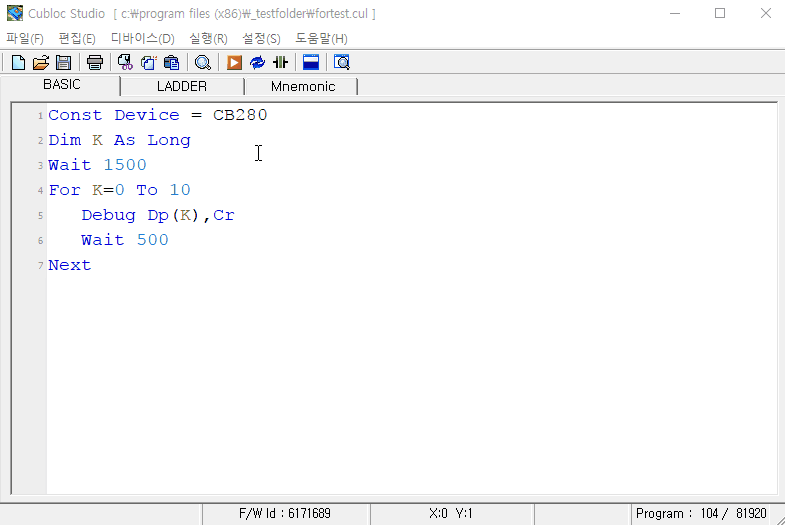 Const Device = CB280 Dim K As Long Wait 1500 For K=0 To 10 Debug Dp(K),Cr Wait 500 Next