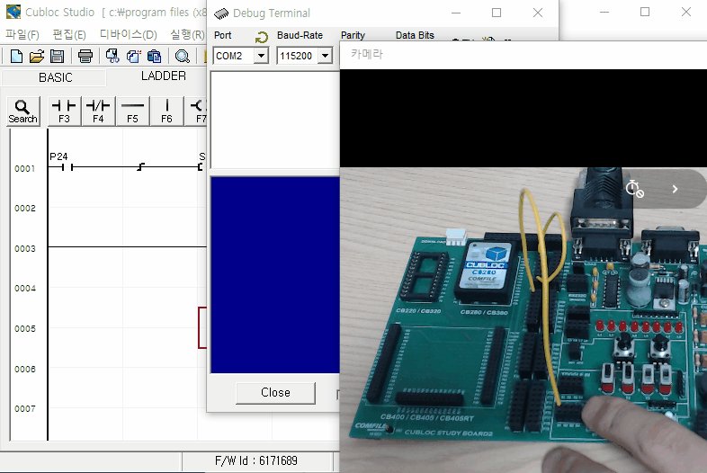 Const Device = CB280 Dim i As Integer Usepin 24,In Usepin 25,In Low 30 Set Ladder On On Ladderint Gosub msg1_rtn Do Loop msg1_rtn: ' 레더에서 인터럽트가 발생하면 Debug 창에 표시 If _D(0) = 3 Then Debug "ON Ladderint #3 ",Cr Endif If _D(0) = 4 Then Debug "ON Ladderint #4 ",Cr Endif _F(40) = 0 Return