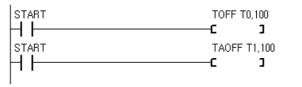 TOFF, TAOFF 명령에는 2 개의 인수가 있습니다. 타이머번호는 T 레지스터중 하나의 값을 지정하고, 설정치로는 상수 및 데이터 레지스터등을 사용할 수 있습니다.
