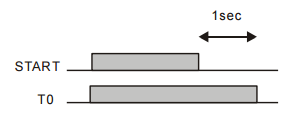 위의 LADDER 에서 START 입력이 들어오면 T0 접점은 바로 ON 됩니다. 이후 START 접점이 OFF 된 뒤 타이 머가 증가됩니다. 0.01 초마다 1 씩 증가되어 증가치가 100 (1 초경과) 이 되면 T0 접점이 OFF 됩니다. TAON 을 사용한 T1 타이머의 경우에는 0.1 초마다 1 씩 증가되어 10 초가 경과되면 T1 접점이 OFF 됩니다.