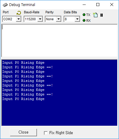 소스를 입력하고, 다운로드 및 실행시켜 보세요. P0, P1 포트에는 풀다운 저항이 있는 스위치입력을 연결한 뒤 스위치를 눌러보면, 디버그 터미널에 다음과 같은 멧세지가 표시됩니다.