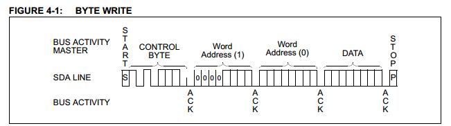 EEPROM 에 WRITE하는 동작부터 설명드리겠습니다. 데이터 시트를 보니 다음과 같이 I2C 통신을 하면 EEPROM 에 한바이트를 라이팅할 수 있다고 그림이 나와있습니다.