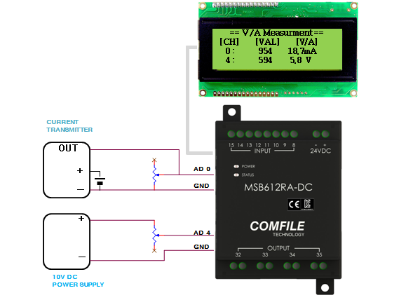 MSB612의 아날로그 AD체널을 이용하여 전압과 전류를 측정하여 V, mA로 표시해주는 어플리케이션 입니다.