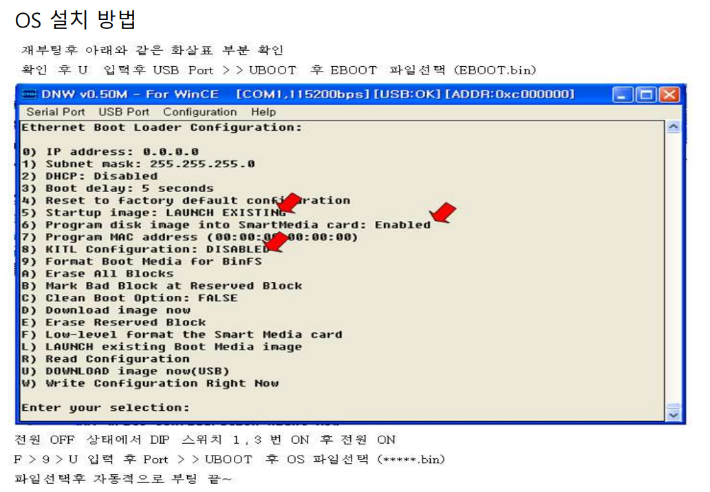 - Dip스위치 1번 ON : FLASH로부터 부팅, OFF : SD카드로부터 부팅