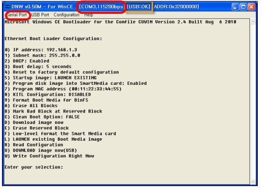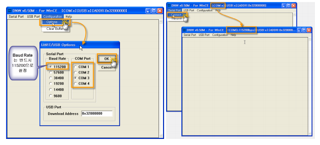 우선 Configulation option을 눌러서, RS232C 셋팅상태를 조정하고, SERIAL PORT메뉴를 눌러서 Connect를 누르고 USB 가 OK인지 확인하자.