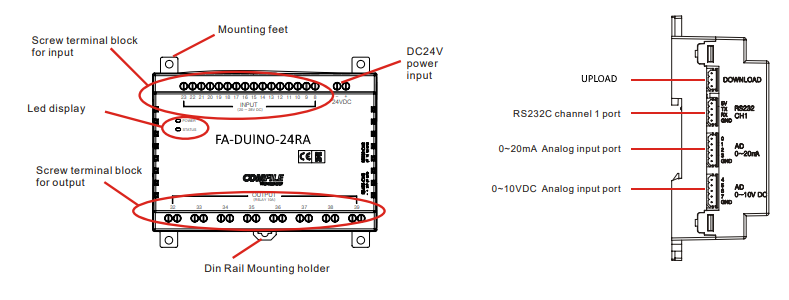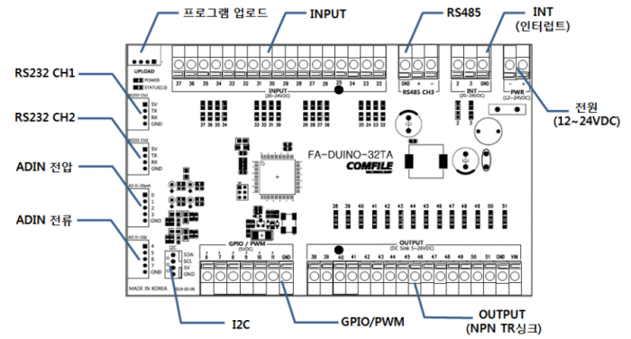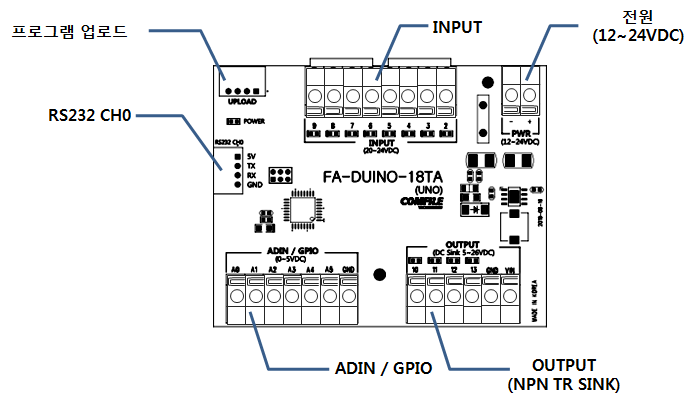 Keywords: FADUINO, FADUINO-18TA, FADUINO-32TA, FADUINO-12RA, FADUINO-24RA, FADUINO 업로드 포트, USB-C 업로드, RS232C 업로드, FADUINO 통신 포트, RS232C, RS485, PWM 출력, 릴레이 출력, 산업용 컨트롤러