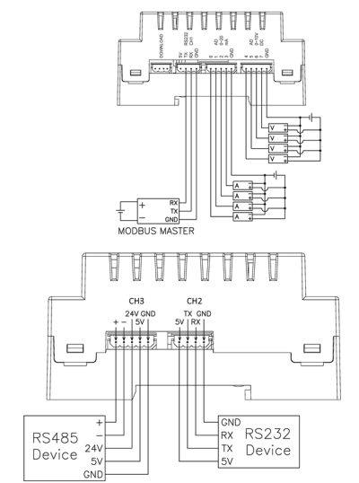 - 업로드 포트와 RS232C 채널 0은 내부적으로 연결되어 있습니다