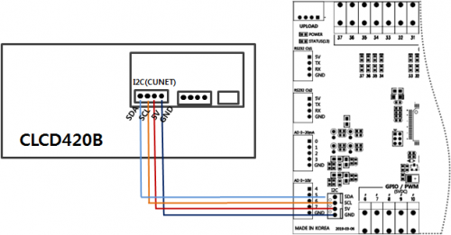 FADUINO-32TA는 CLCD 전용 I2C 연결 포트를 제공합니다. 이 방식은 시리얼 방식보다 배선이 간단하며, 안정적인 통신이 가능합니다.