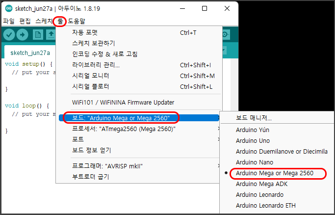 - 툴 > 보드 > Arduino Mega or Mega2560 설정