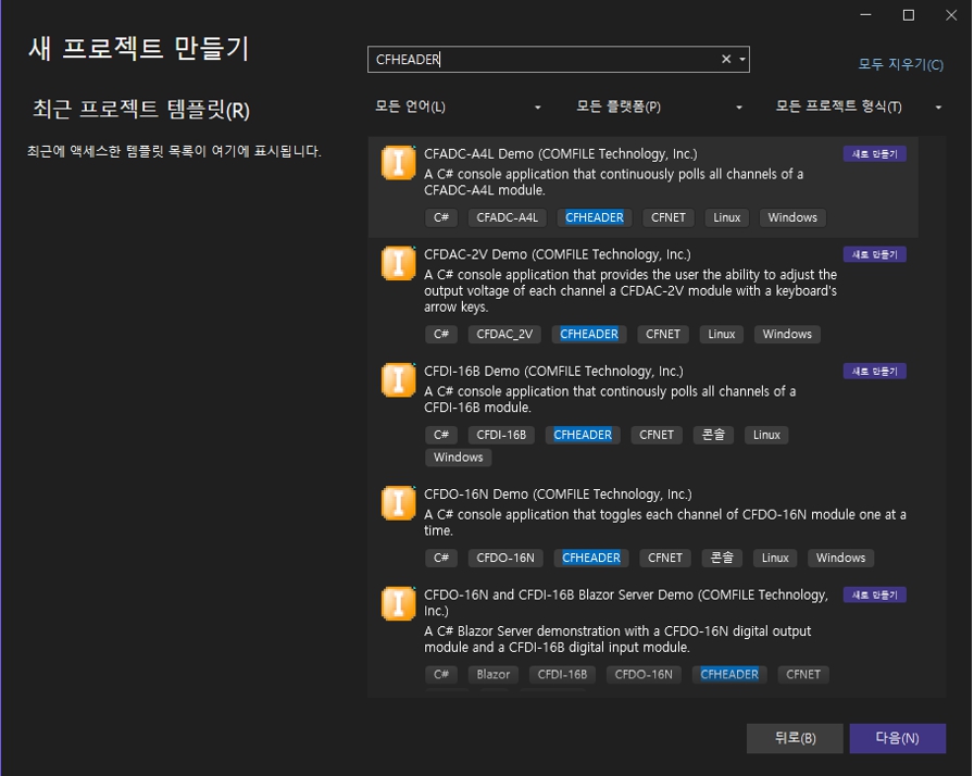 - Visual Studio 실행 » 새 프로젝트 만들기 » 검색에 “CFHEADER” 에서 Demo프로그램을 사용할 수 있습니다.