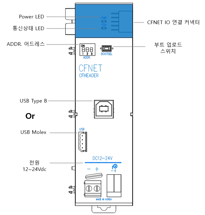 - 통신상태 LED : 연결된 CFNET IO 모듈의 통신상태를 LED로 확인할 수 있습니다.