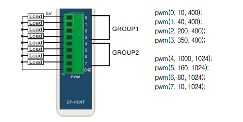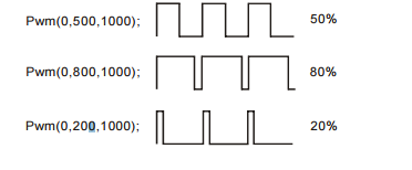 PWM 출력포트에는 5V 의 PWM 파형이 출력하는 함수입니다. 원하는 채널에 듀티비, 주기값등을 정해주면, 해당 듀티비를 가진 PWM 파형이 출력됩니다. 주기값은 최대 65535 까지 사용할 수 있으며, 이 범위 내에서 듀티비를 설정할 수 있습니다.