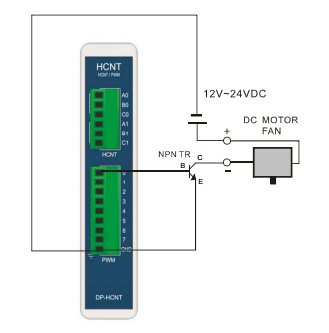 5V 의 PWM 출력으로는 매우 작은 전류만 흘릴 수 있기 때문에, 큰 전류를 소비하는 부하를 직접 구동하는 것은 불가능합니다. 아래 그림처럼 NPN TR 을 부착하면 큰 구동전류를 필요로하는 DC 모터나 팬모터의 속도를 제어할 수 있습니다.