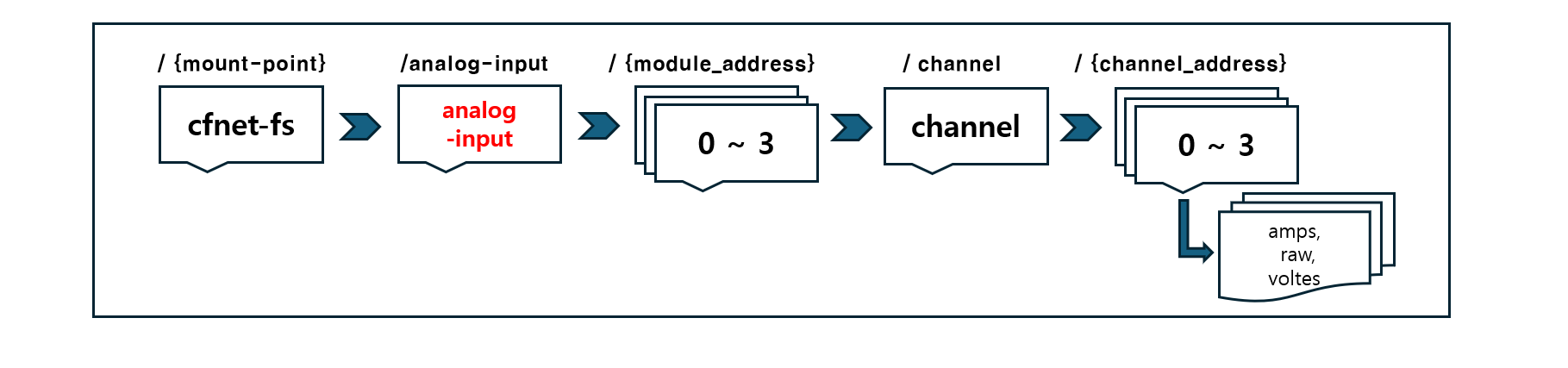 아날로그 입력모듈(CFADC)은 아래에 설명된 /analog-intput/{module_address}/channel/{channel_address}디렉터리의 amps, raw, voltes 파일을 통해 아날로그 값을 읽을 수 있습니다.