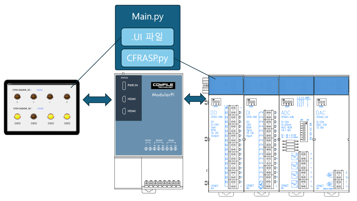 본 장에서는 Modular Pi + CFNET I/O 모듈(CFDI, CFDO 등)을 활용하여 PyQt 기반 HMI(UI)프로그램을 구현하는 방법을 설명합니다.